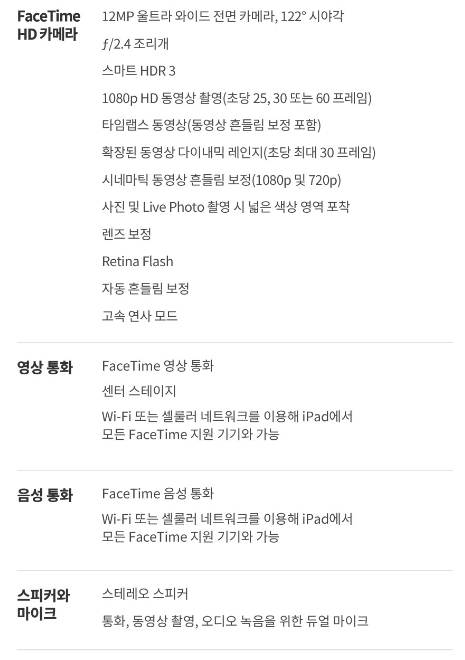 울트라 와이드 전면 카메라의 경우 센터 스테이지 기술이 적용되어 최상의 화질을 제공하며 와이츠 후면 카메라의 경우 4K 동영상까지 촬영이 가능합니다.